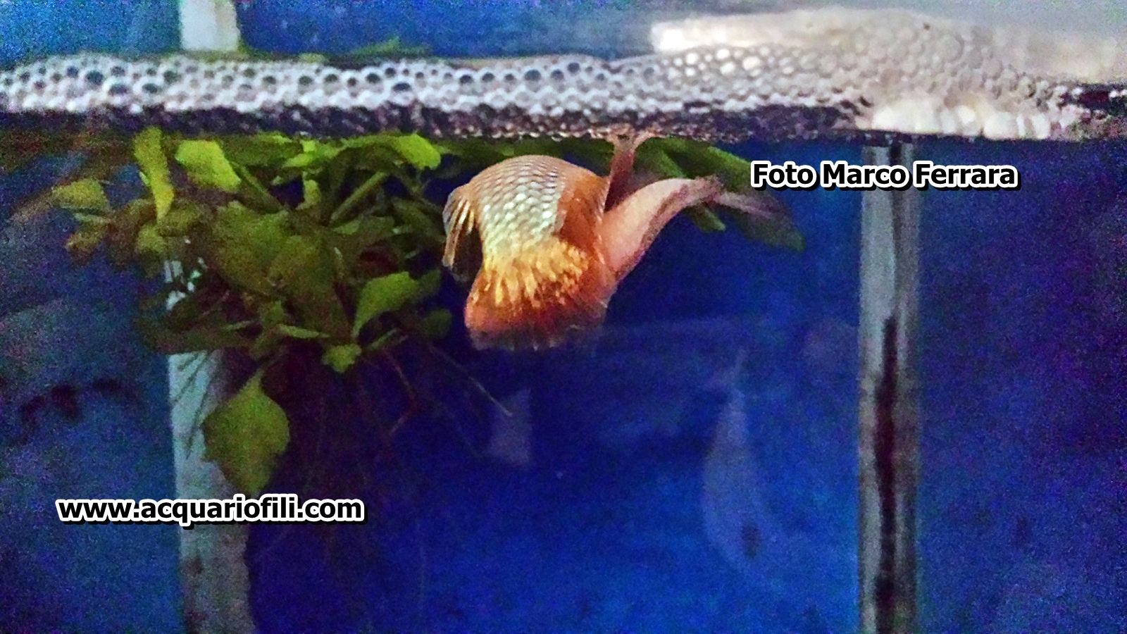 Nel nido potranno essere deposte fino a circa 200 uova e successivamente la femmina abbandonerà il nido. Le uova saranno custodite dal maschio che diventa molto protettivo, infatti per tentare la riproduzione è consigliabile utilizzare una vaschetta a parte, un po’ come si fa per la riproduzione dei betta. Successivamente alla schiusa che avverrà in una settimana circa o poco più, gli avannotti dovranno essere nutriti con dei micro vermi, come si fa per le larve di betta, per poi passare ai naupli di artemia, anguillole dell’aceto e tutti i tipi di cibo vivo adatti agli avannotti.