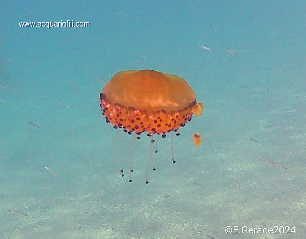Accanto ad essa, come di consueto, ed è anche una caratteristica particolare di questa medusa, nuotano degli avannotti o dei giovani di ricciola che le gironzolano attorno poichè trovano rifugio e nutrimenti tra i suoi tentacoli.