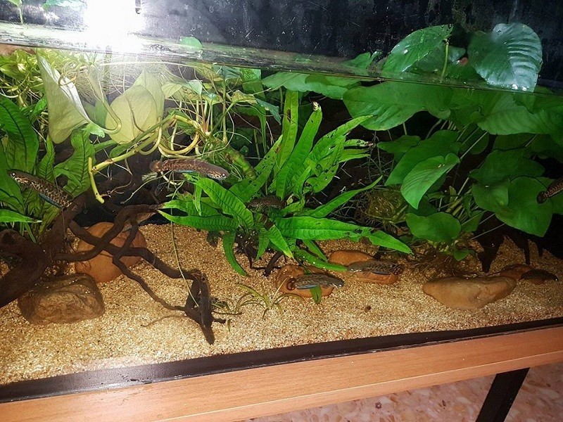 L’acquario deve sempre essere allestito con una fitta vegetazione, molte piante galleggianti, legni intrecciati e numerosi altri nascondigli, acqua con flusso lento e colonna d’acqua dimezzata; si ricorda di tenere sempre la vasca ben chiusa perchè possono facilmente scappare.