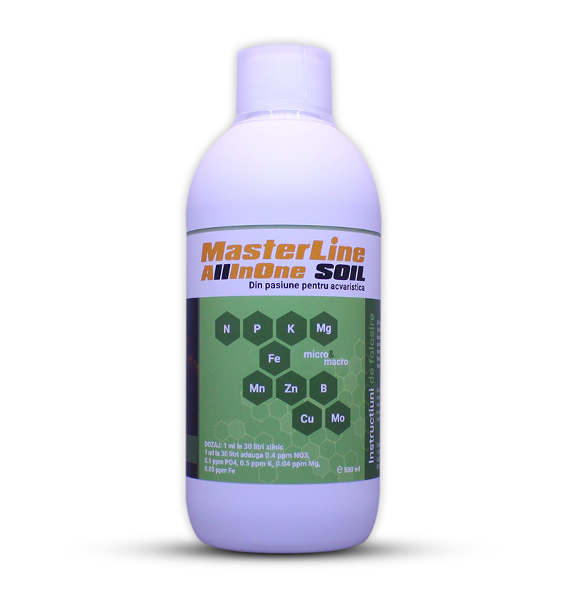 MasterLine AllInOne Soil è una formula realizzata per essere utilizzata in acquari con fondo attivo tipo Soil e con l’impiego di CO2 , impiegato giornalmente contribuisce ad una crescita lenta e rigogliosa favorendo la pigmentazione spingendo verso una nutrizione radicale. Disponibili in flaconi da 500 e 1000ml.